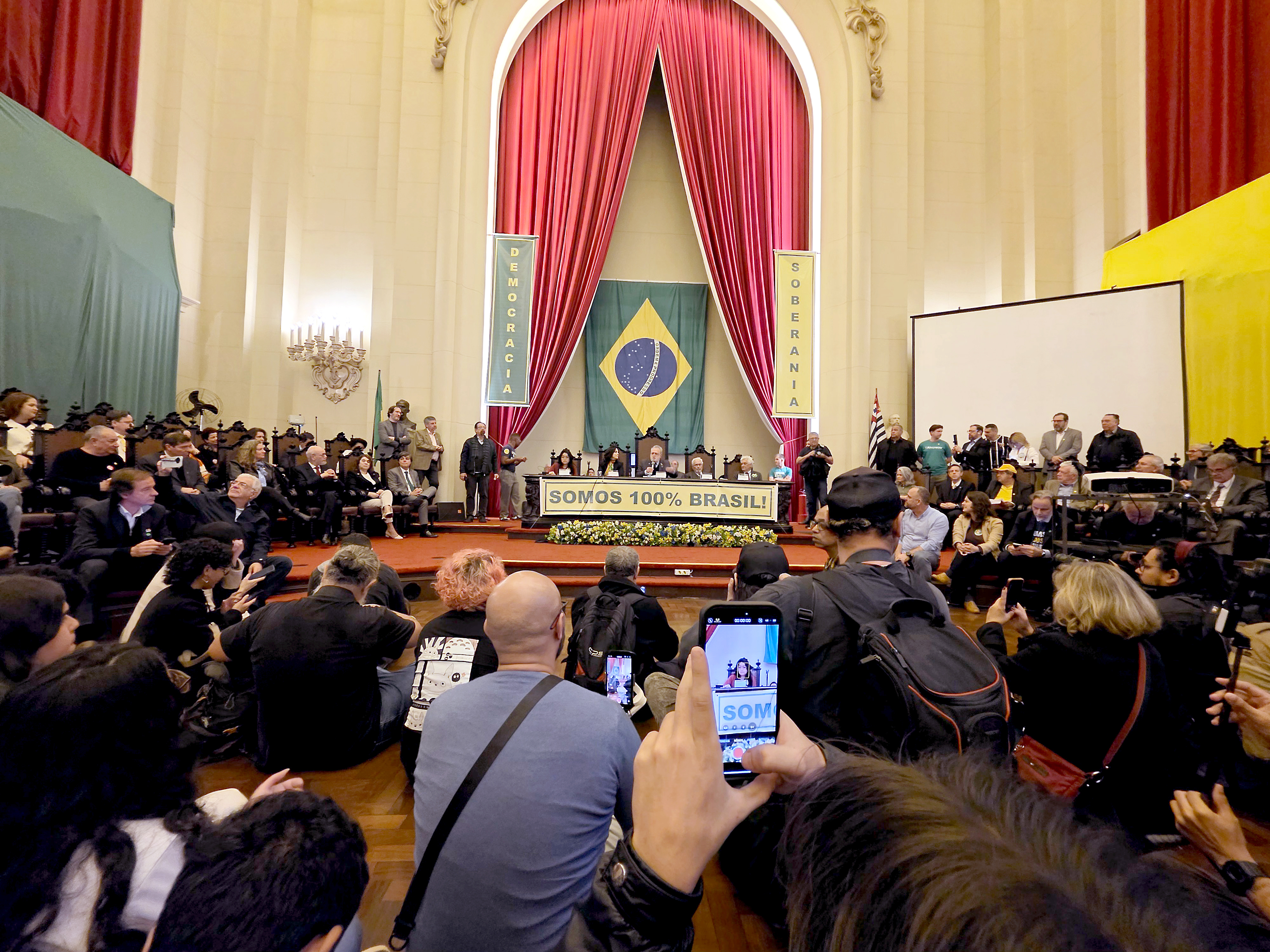 Um som ecoou do Salão Nobre da Faculdade de Direito da USP para todo o mundo: “Somos 100% Brasil”. Dessa forma se deu o Ato em Defesa da Soberania Nacional (25/07). O espaço, lotado, com bandeiras do Brasil, faixas verde e amarelo e banners – com os dizeres “Soberania” e “Democracia” – reuniu mais de 1 mil pessoas (no Salão e mais algumas centenas em outras salas) com o objetivo de defender a Nação. Tomou a direção de rechaçar as tentativas de “intromissões estranhas à ordem jurídica nacional e econômica”, diante das ameaças ao Judiciário e de taxação aos produtos brasileiros, anunciadas pelo presidente dos Estados Unidos, Donald Trump.